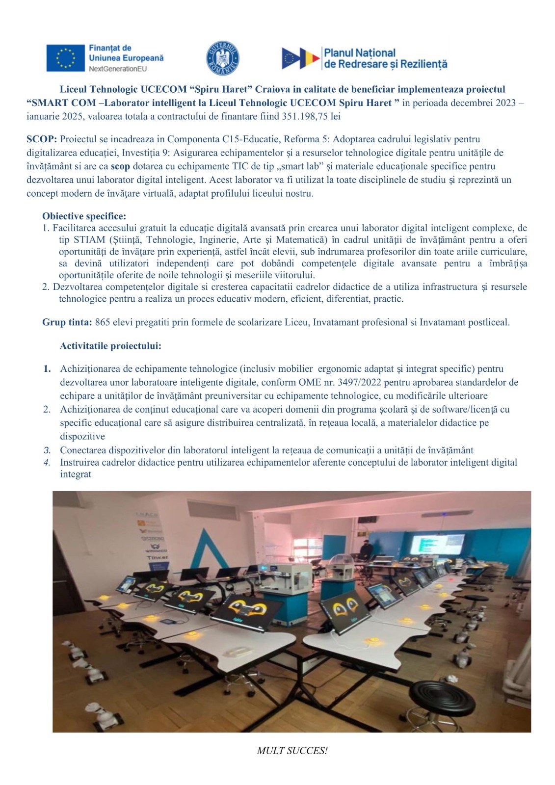 - * Comunicat de presă -încheierea proiectului cu titlul SMARTCOM - Laborator inteligent la Liceul Tehnologic UCECOM „Spiru Haret” Craiova finanțat prin PNRR - Fonduri pentru România modernă și informată! (Cod proiect F-PNRR-SmartLabs 2023-2568)